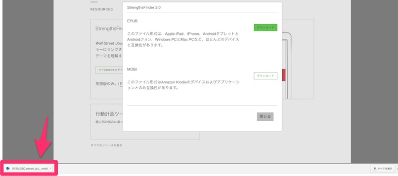 画面を少し下にスクロールしていただき、「StrengthFinder 2.0」 と書いてあるところの「マイEBOOKのダウンロード」をクリック。