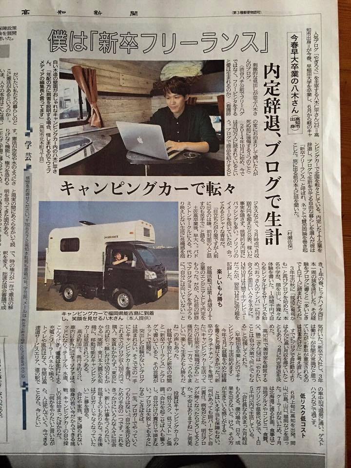 高知新聞に掲載していただきました 2017 12/13 広告 お知らせ 2017年12月13日 本日2016年6月28日の高知新聞朝刊に掲載していただきました。 大学卒業後そのままフリーランスになり、キャンピングカー生活を始めたことについて取材を受け、記事にまとめていただいたいます。 最後まで読んでくださった方への、2つのお知らせ 700名以上が参加した、自己理解プログラム無料カウンセリング [無料]本の無料試し読み & 夢中な働き方を作る3ステップ講座 ピックアップ記事 【初めてこのサイトへ来た人へ】やりたい仕事が見つからない人が、必ず最初に読むべき記事。これで人生を変えましょう お知らせ よかったらシェアしてね! URLをコピーしました! URLをコピーしました!